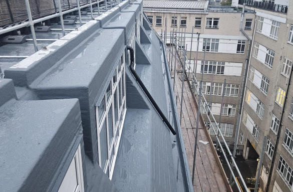 Repairs were required to some areas of the existing asphalt substrate prior to the new waterproofing coating being installed due to damage caused by the feet of the decking system. The project consisted of some pitched mansard roofs which were difficult to coat. Proteus Waterproofing worked with the contractor to ensure these areas could be worked on safely via use of scaffolded access.